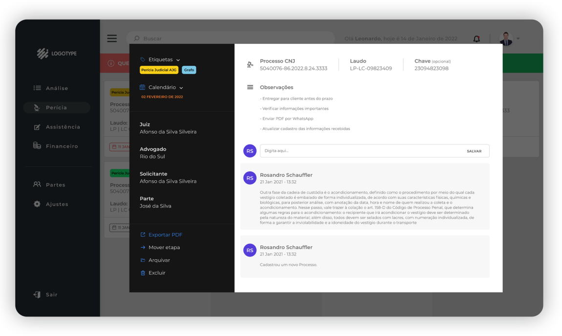 Este produto digital foi desenvolvido para atender uma demanda de peritos que precisavam organizar o seu laboratório de perícia com prazos e informações importantes.
